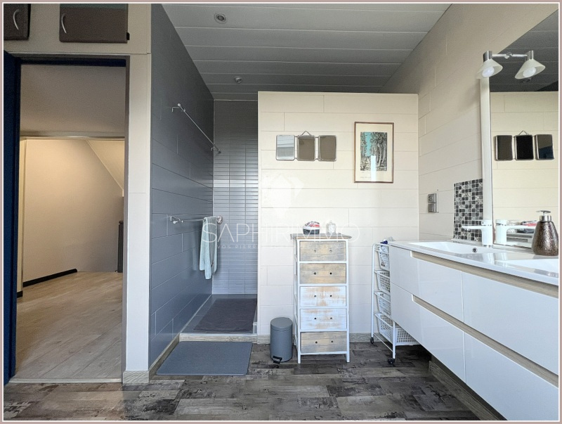 - au premier étage : un palier desservant un salon/séjour traversant (Sud-Nord) d'environ 21m², un wc indépendant, une vaste salle d'eau avec rangements, une cuisine entièrement aménagée et équipée donnant directement sur une terrasse semi-couverte ;